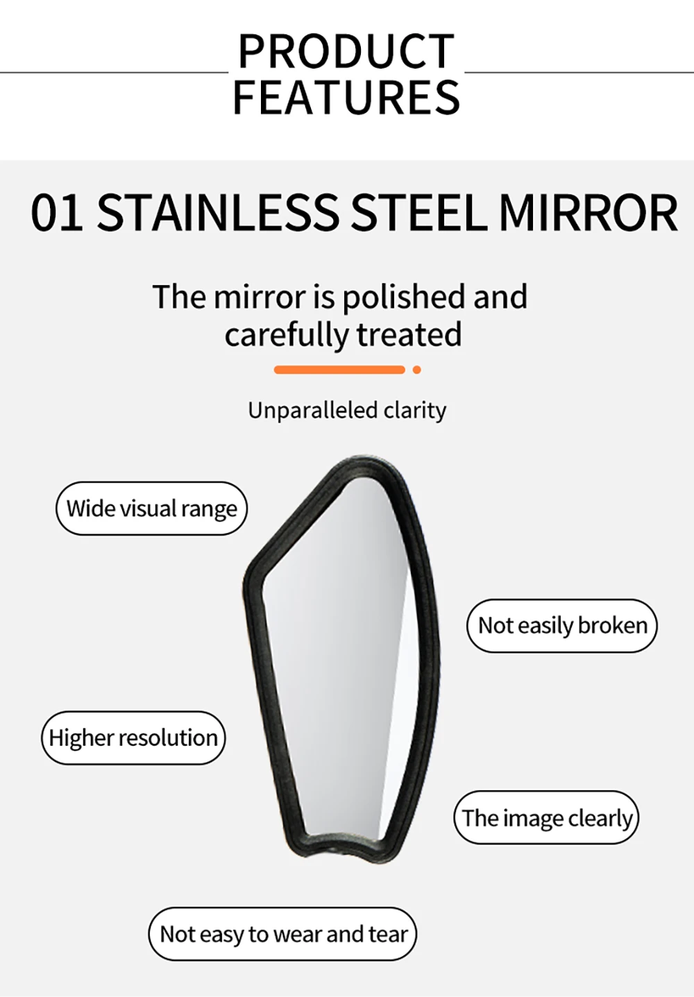 O espelho: AÇO INOXIDÁVEL, RESISTÊNCIA À IMPACTO, SEM QUEBRA, O ESPELHO É POLIDO E CUIDADOSAMENTE TREADO, AMPLA GAMA AVISUAL E IMAGEM CLARA